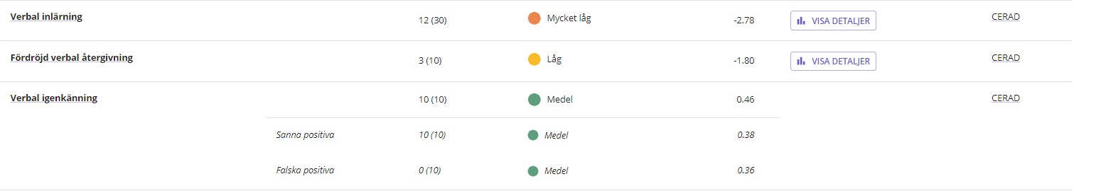 Verbal inlärning: Det totala antal ord som personen uppgav tillsammans i alla försök. Genom att klicka på "Visa detaljer" går det att se en detaljerad vy över hur orden har fördelat sig genom försöken.