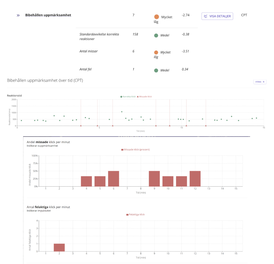- Tabeller och grafer över tidsintervaller ger en överblick av prestation över tid och visar eventuella förändringar i uppmärksamhet och reaktionstid.
