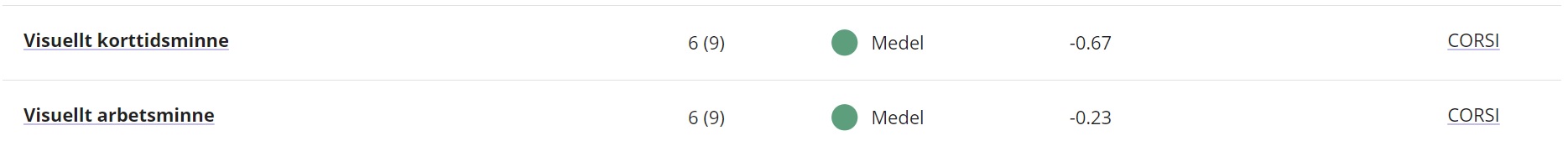 Nedsättningar i Corsi indikerar att det visuella korttidsminnet och arbetsminnet är påverkat. Detta kan vara användbart om personen klagar över nedsatt minne och har svårt att hålla information i huvudet. Då bör hen få stöd för det visuella minnet som strategi och/eller använda verbala strategier om det verbala minnet fungerar bättre.