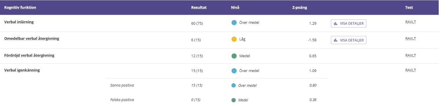 Verbal inlärning: Det totala antal ord som personen uppgav tillsammans i alla försök. Genom att klicka på "Visa detaljer" går det att se en detaljerad vy över hur orden har fördelat sig genom försöken.